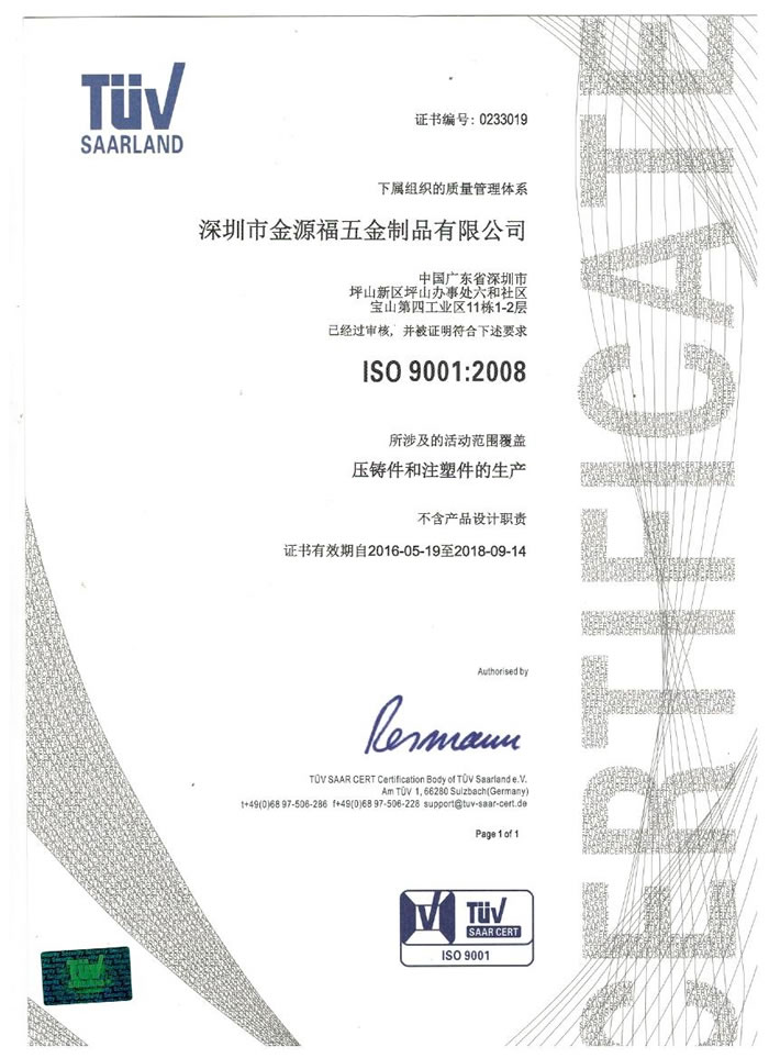 深圳市金源福五金制品有限公司成立于2003年。公司擁有8000多平方米生產(chǎn)廠(chǎng)地、開(kāi)發(fā)與管理精英人才、技術(shù)專(zhuān)業(yè)、設(shè)備精良、交通便利、服務(wù)周全、具體設(shè)計(jì)、開(kāi)發(fā)、制模、出樣、生產(chǎn)到成品出貨一體化模式生產(chǎn)廠(chǎng)家。已通過(guò)ISO9001:2008ISO1440/TS16949:2009國(guó)際質(zhì)量體系認(rèn)證。專(zhuān)業(yè)生產(chǎn)鋅合金壓鑄、鋁合金壓鑄產(chǎn)品、汽車(chē)配件、汽車(chē)后視鏡支架、車(chē)載導(dǎo)航散熱器、LED散熱器、LED燈罩、數(shù)碼電子五金結(jié)構(gòu)件、家具五金裝飾件、標(biāo)牌(LOGO)等五金壓鑄產(chǎn)品。